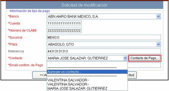 del contacto seleccionado hacer clic sobre el botón Contacto de Pago.